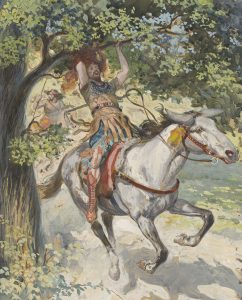 ボヘミアのRudolf von Ems(c. 1200 – 1254)による Weltchronik(世界年代記)の挿絵「Ahitofel erhängt sich(アヒトフェルは首を吊る)」(Wikimedia Commonsより)