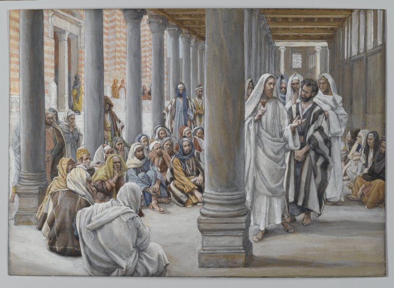 フランスの画家 James Tissot (1836–1902) による「Jesus Walks in the Portico of Solomon(イエスはソロモンの廊を歩く)」(Brooklyn Museum蔵、Wikimedia Commonsより)