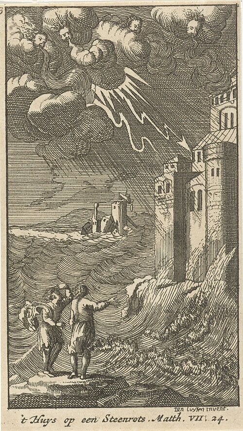 オランダの版画家 Jan Luyken(1649-1712)による「house built upon a rock; house built upon sand(岩の上に建てられた家と砂の上に建てられた家)(Wikimedia Commonsより)