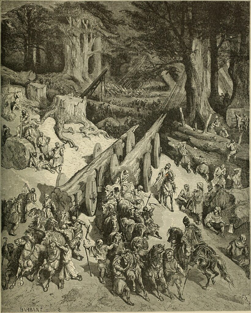フランスの画家 Gustave Doré(1832-1883)による「Cutting down cedars for the construction of the Temple(神殿建設のための杉の木の伐採)」(Wikimedia Commonsより)